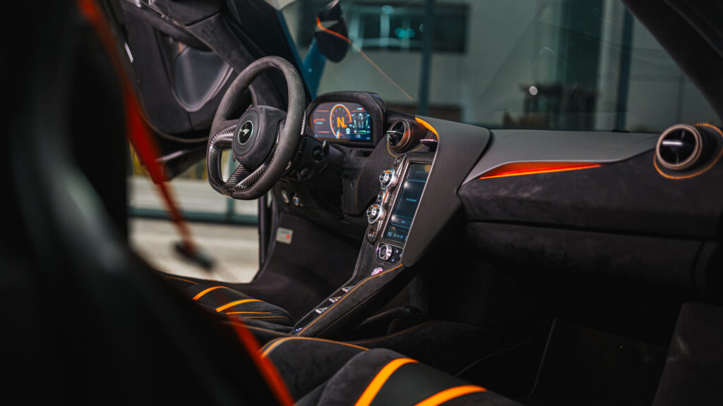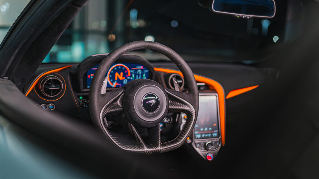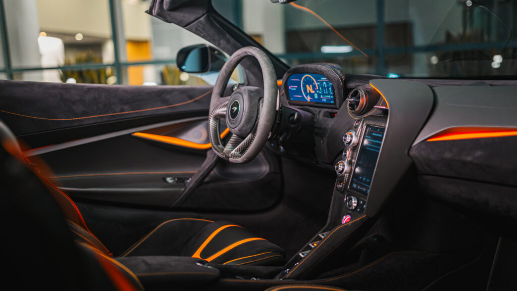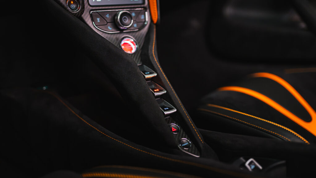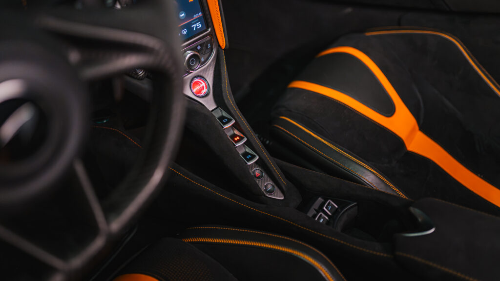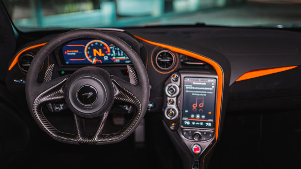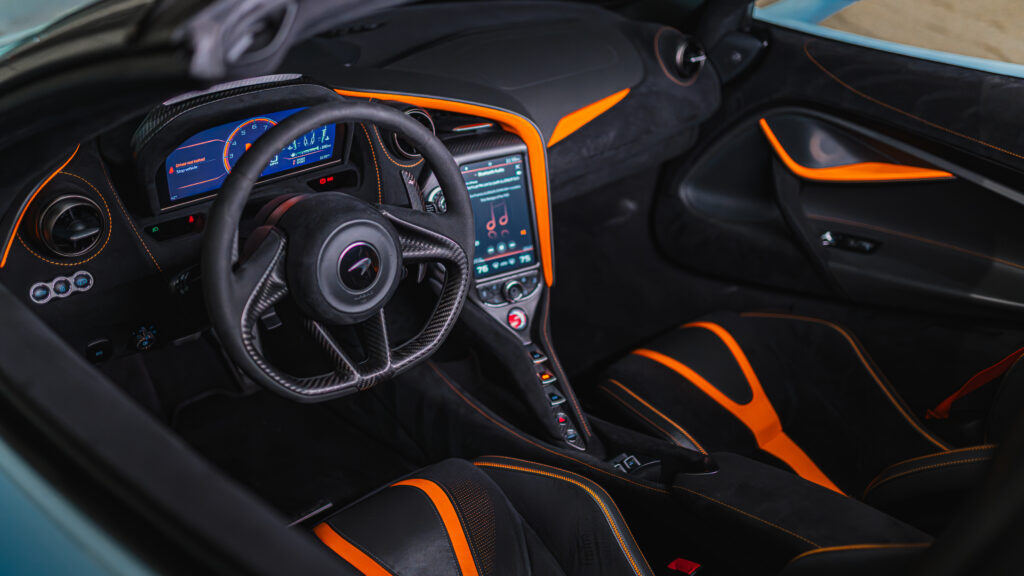 Inside, the McLaren 720S Spider wraps you in a driver-focused cockpit finished in a striking MSO Black and Orange interior. Carbon Pack 2 enhances the cabin and exterior with beautifully integrated interior carbon elements, elevating the car’s already premium atmosphere. Premium materials, performance-oriented seating, cutting-edge technology, and McLaren’s signature attention to detail come together to elevate every drive. Paired with the factory sport exhaust system, the 720S Spider delivers an exhilarating sound experience that matches its towering performance.