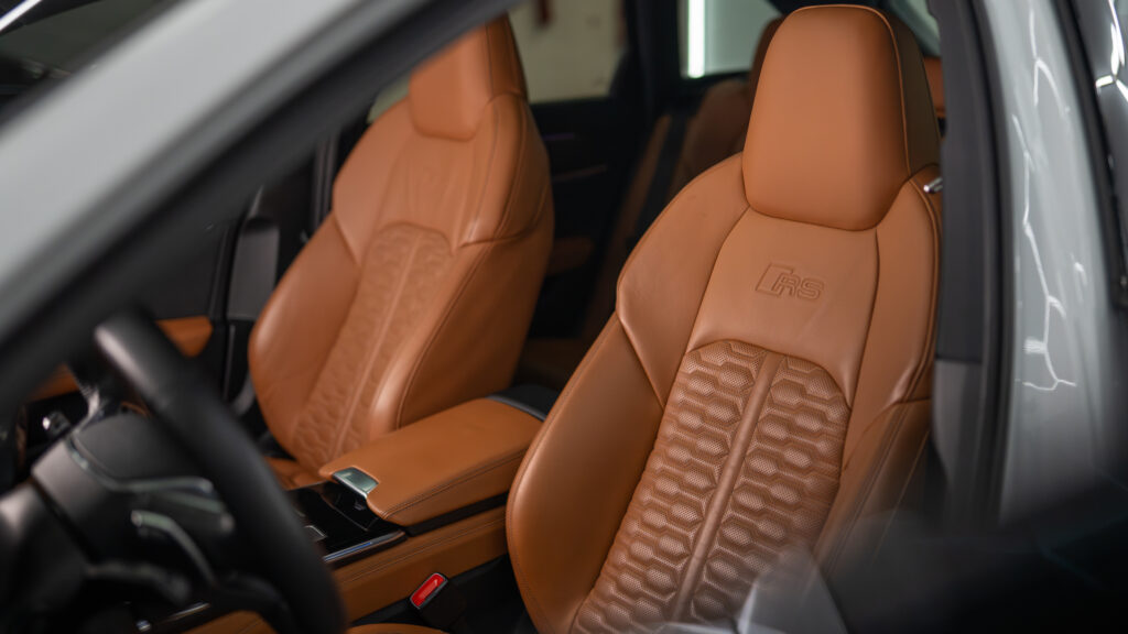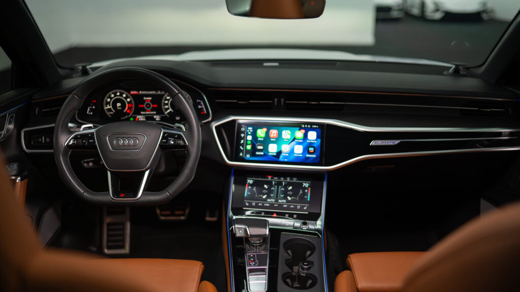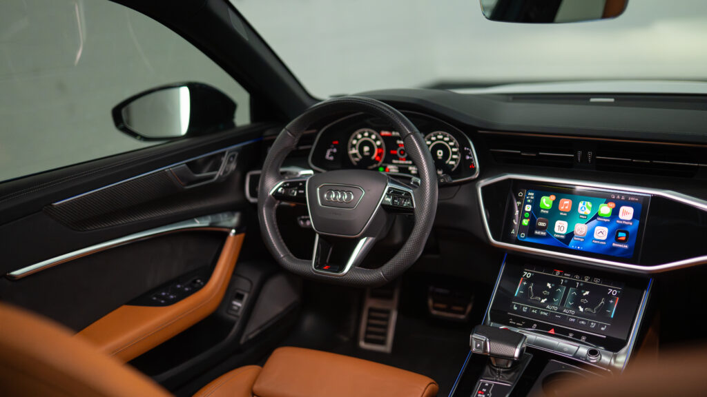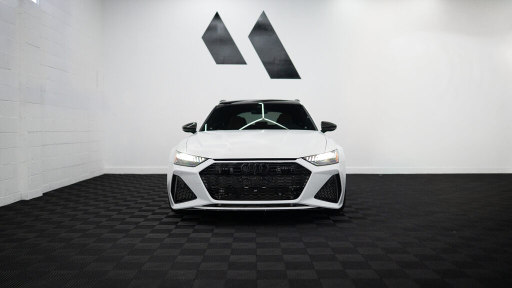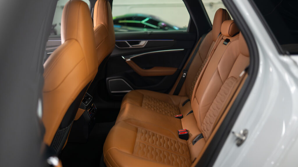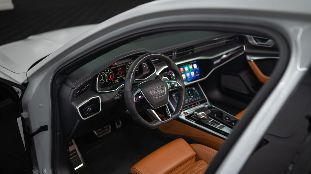 Our 2022 Audi RS6 Avant rental in New York is where supercar performance meets everyday practicality. This high-performance wagon, finished in satin white with a tan leather interior and carbon fiber trim, commands attention while delivering exceptional comfort and style.