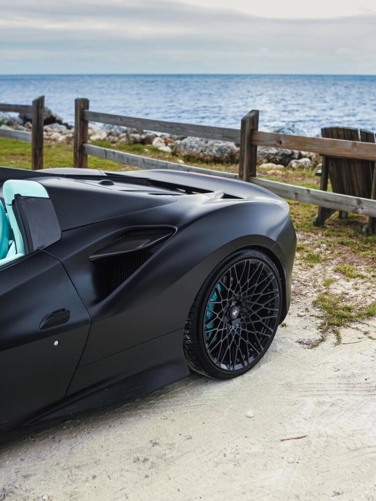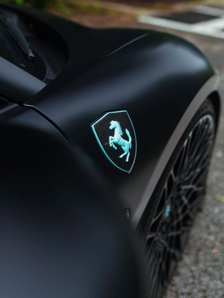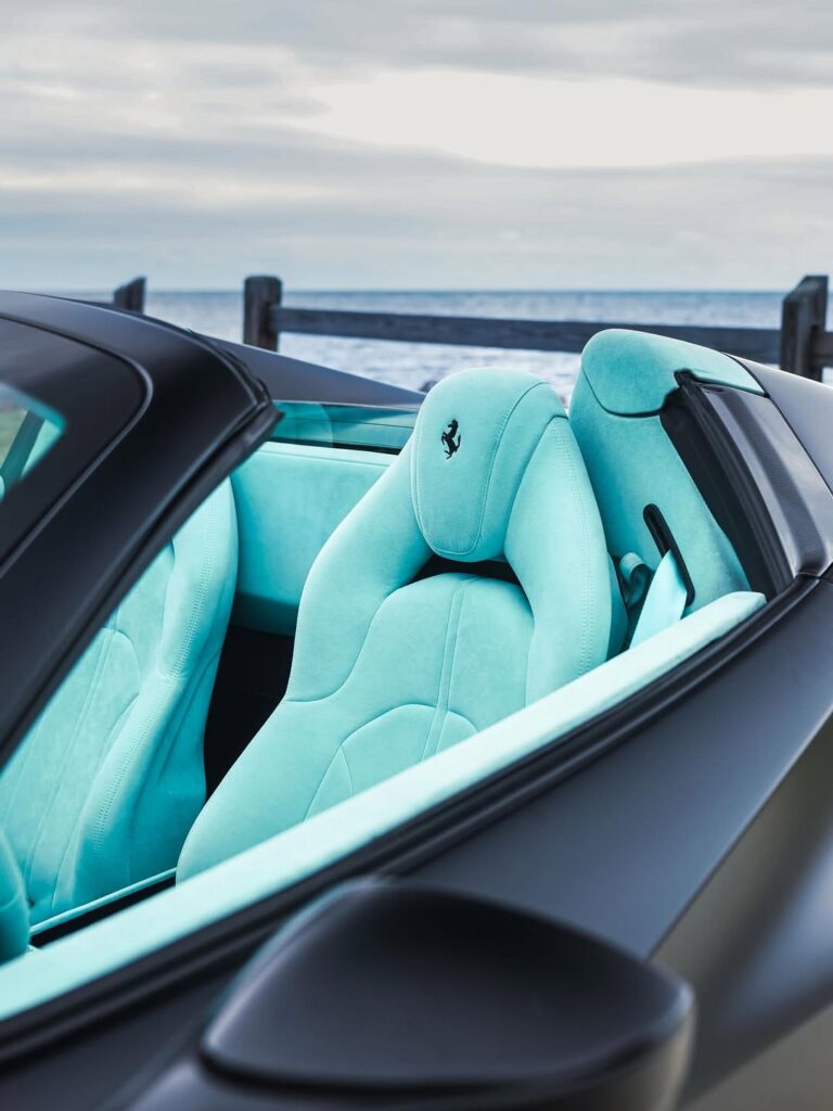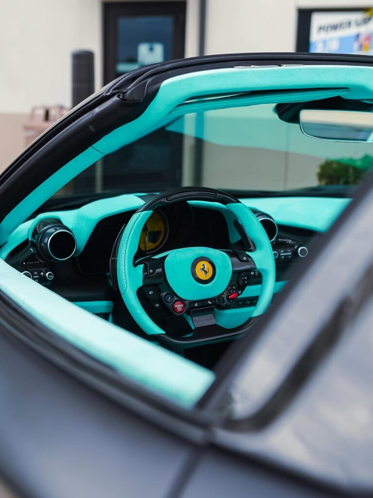Inside, the cabin is nothing short of bespoke. A custom Tiffany blue Alcantara interior creates a striking contrast against the exterior, wrapping the driver in a bold yet luxurious environment. Premium materials, race-inspired ergonomics, and cutting-edge technology come together to create a cockpit that is both driver-focused and visually unforgettable. Every detail is crafted to heighten the driving experience—from the sculpted seats to the signature Ferrari steering wheel controls.