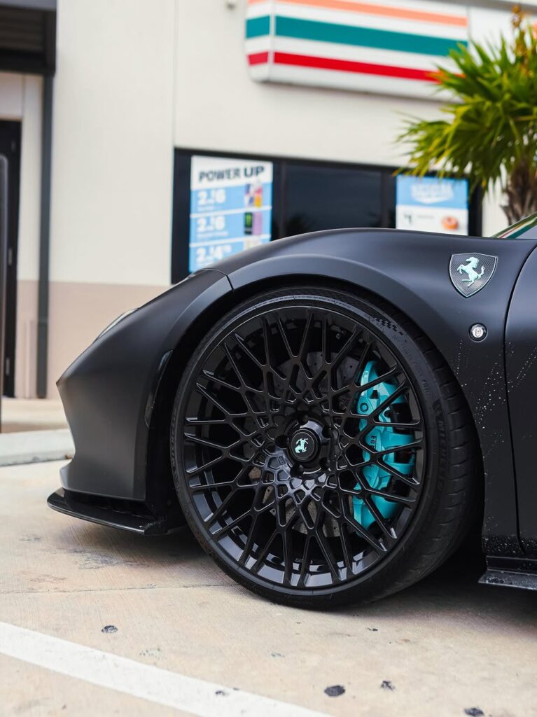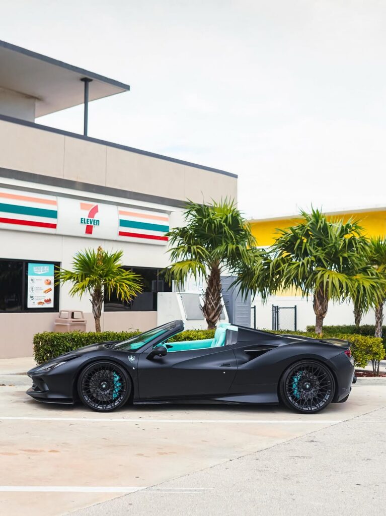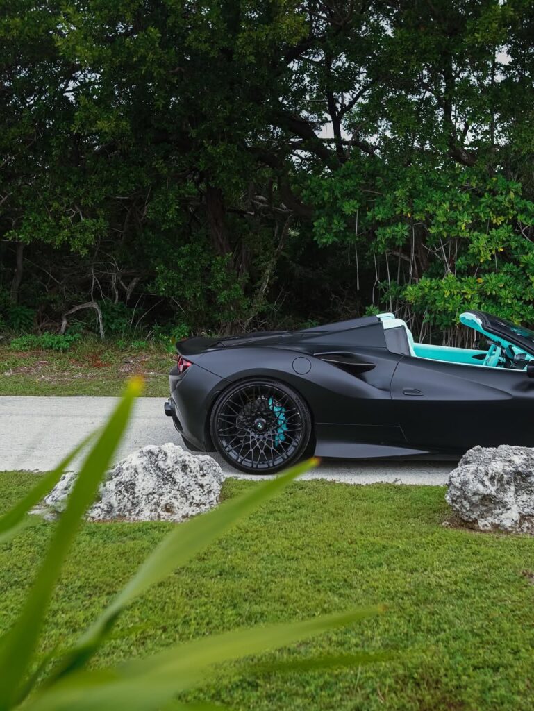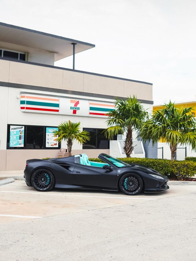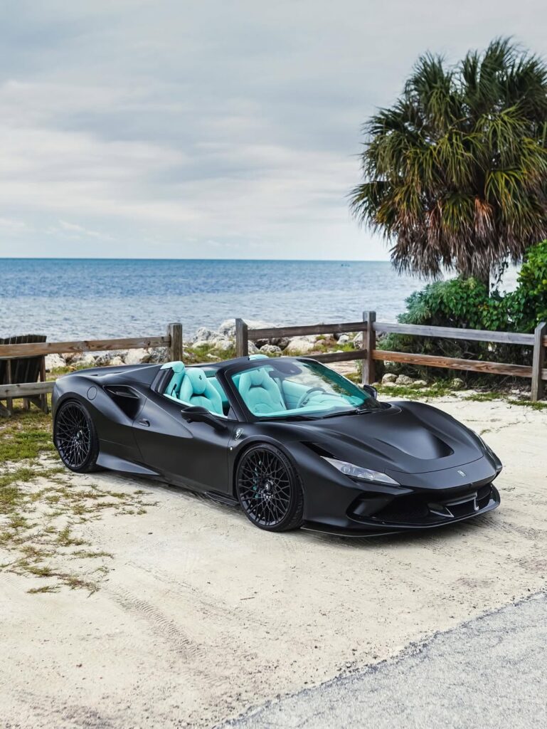 Inside, the cabin is nothing short of bespoke. A custom Tiffany blue Alcantara interior creates a striking contrast against the exterior, wrapping the driver in a bold yet luxurious environment. Premium materials, race-inspired ergonomics, and cutting-edge technology come together to create a cockpit that is both driver-focused and visually unforgettable. Every detail is crafted to heighten the driving experience—from the sculpted seats to the signature Ferrari steering wheel controls.