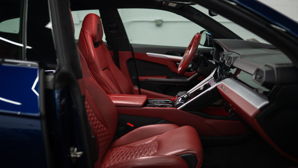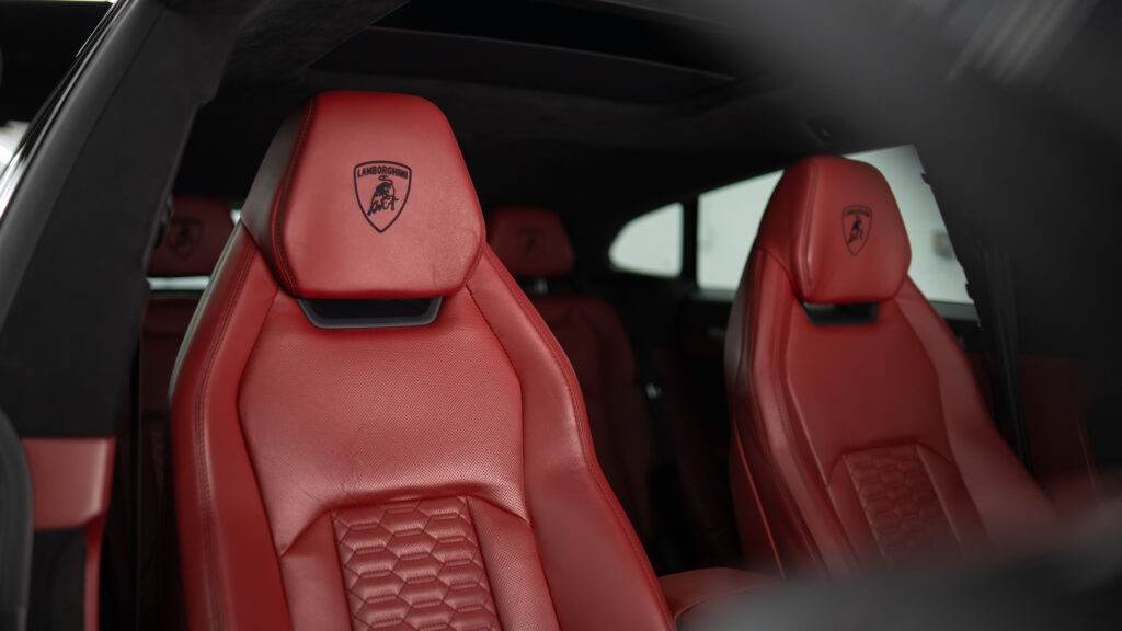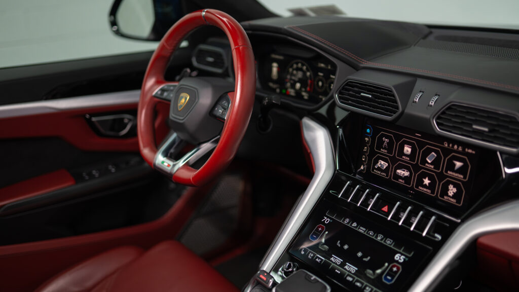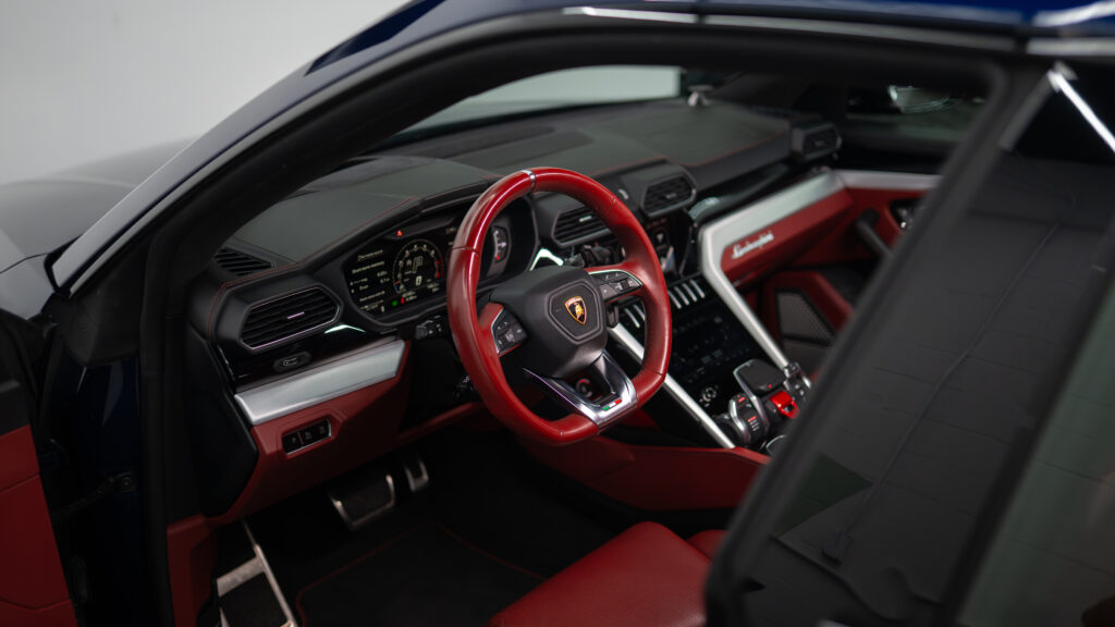 Introducing the 2022 Lamborghini Urus – where Italian craftsmanship meets heart-pounding performance. Perfect for a Lamborghini Urus rental in New York, this stunning SUV turns every drive into an unforgettable experience. Finished in a striking blue exterior and paired with a bold red interior, it features intricate stitching and Alcantara accents that elevate its luxurious appeal.