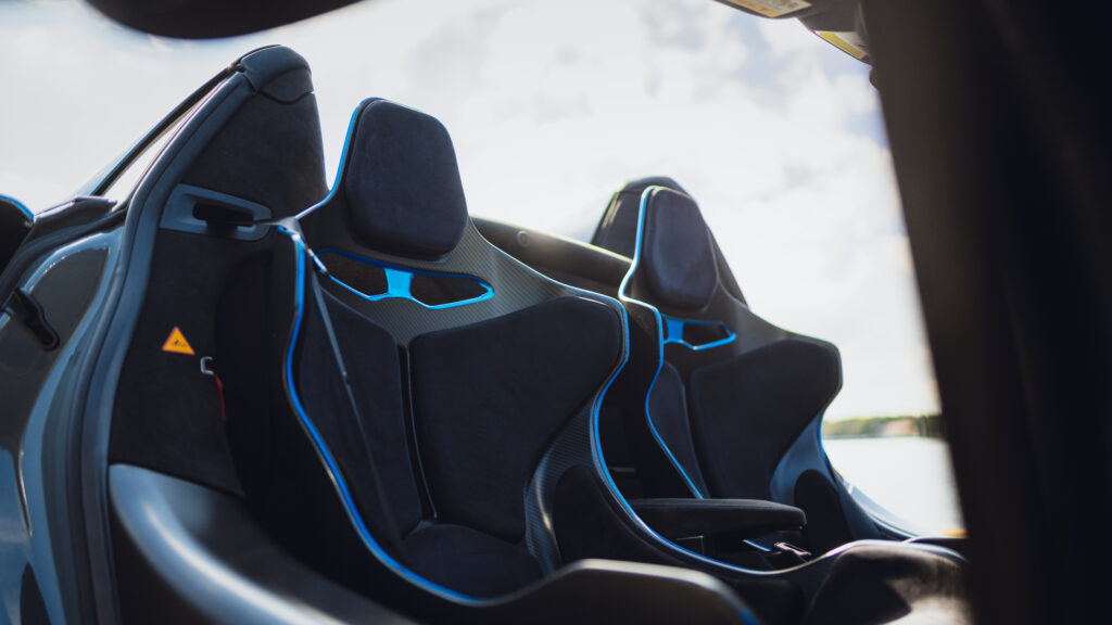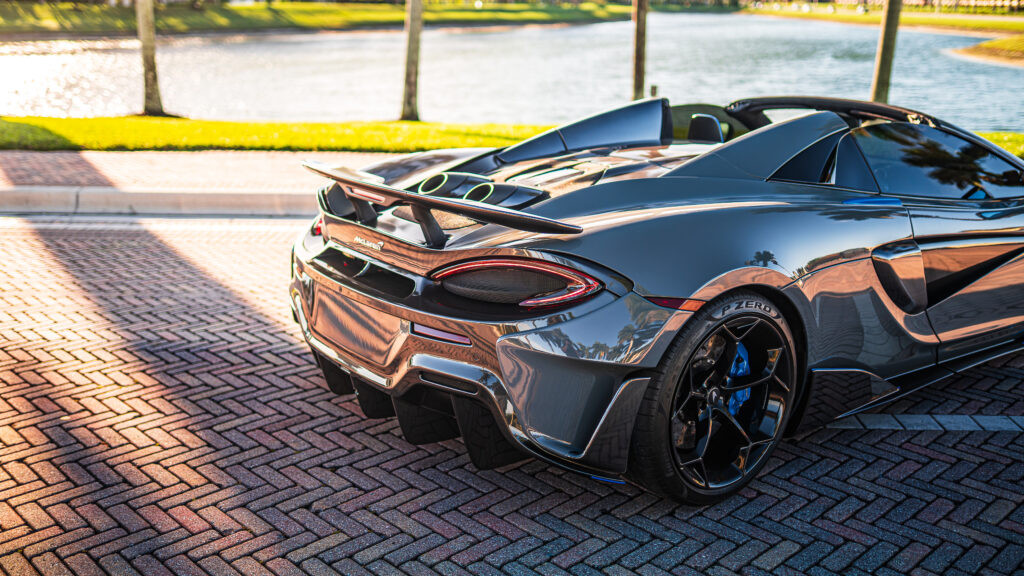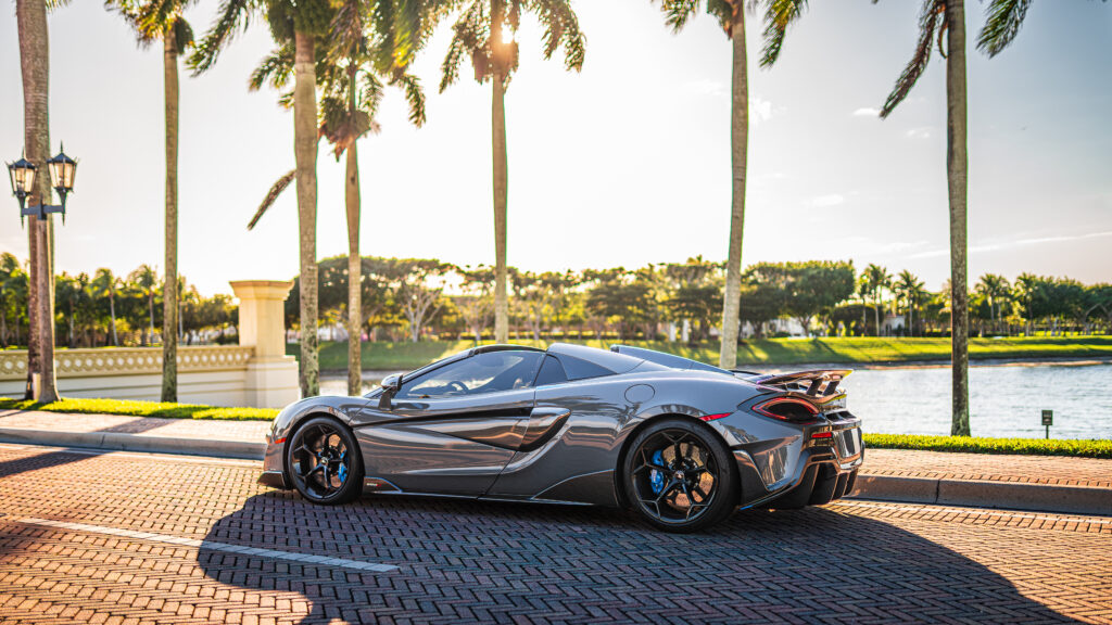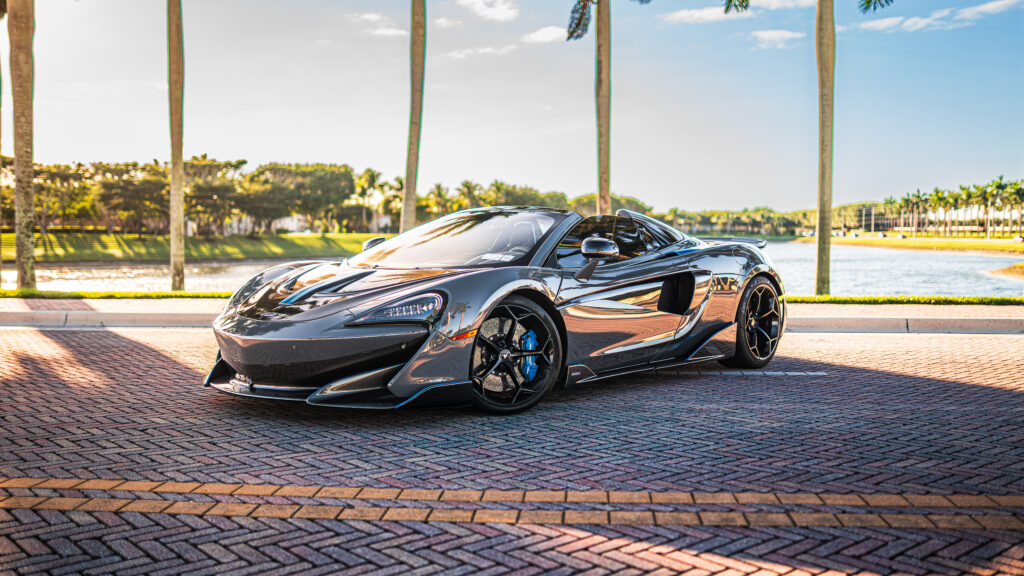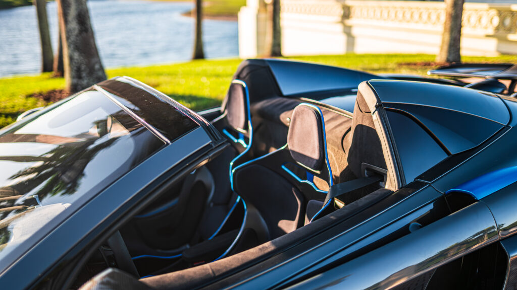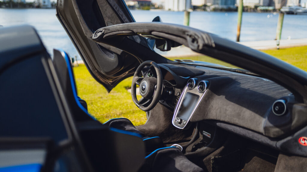 The 2020 McLaren 600LT Spider delivers the perfect balance of raw performance and open-air freedom. Our McLaren 600LT rental in South Florida turns every drive into an unforgettable supercar experience. Finished in a striking gray with exposed carbon fiber and bold blue accents, its aggressive stance is matched by purposeful design. Inside, the black Alcantara interior is complemented by lightweight Senna seats, crafted for both support and speed.